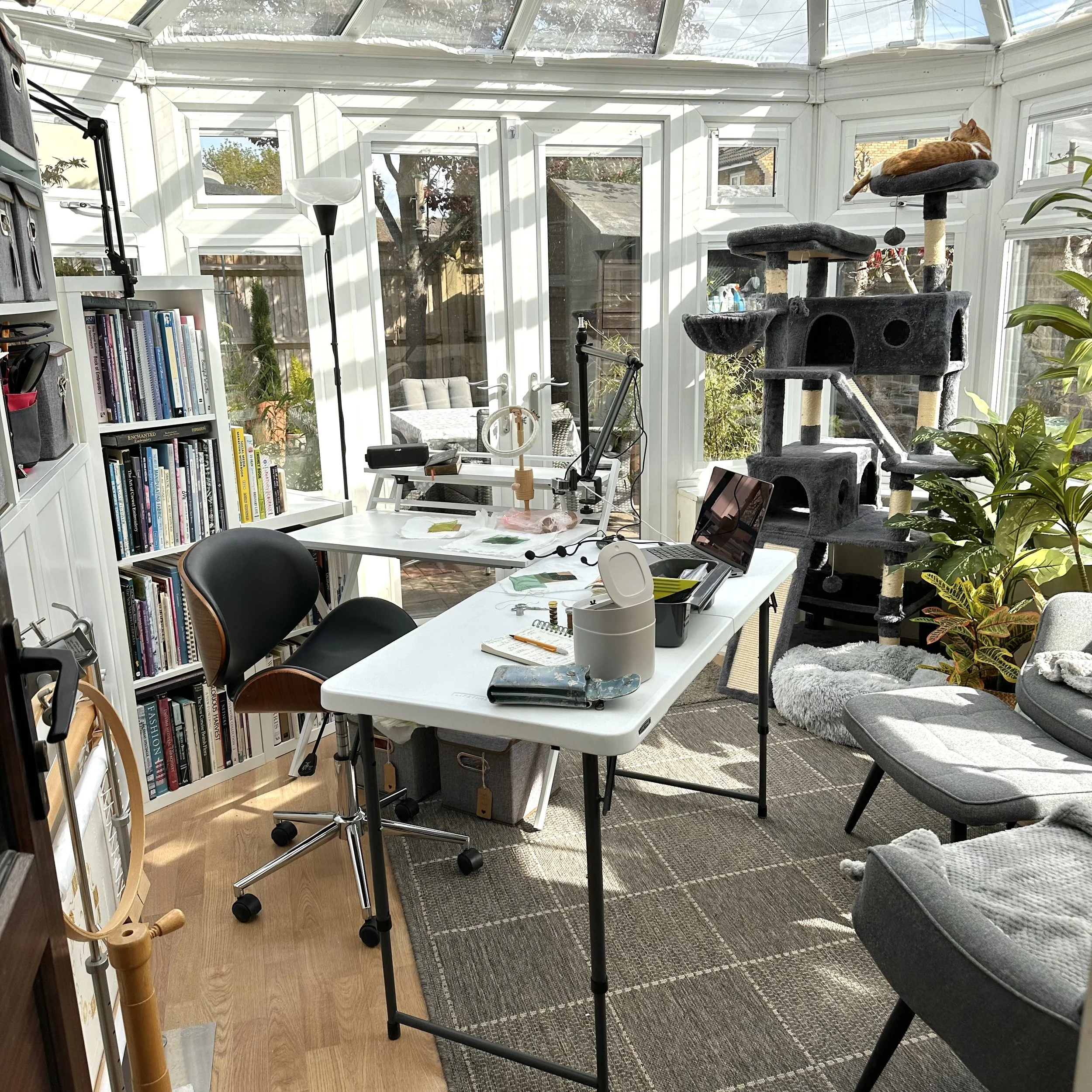 I live on the outskirts of London, a (long) stone’s throw from the Thames, in a house I call Tiny with its conservatory known as the Glass Tent. My garden is equally compact and filled with plants, the sound of trickling water and (if I’m lucky) sunshine. Here I design and stitch, write and film all the lovely things I offer up to my students. This truly is my sanctuary, and I hope to share its beauty, calm and inspiration with you all through the year.