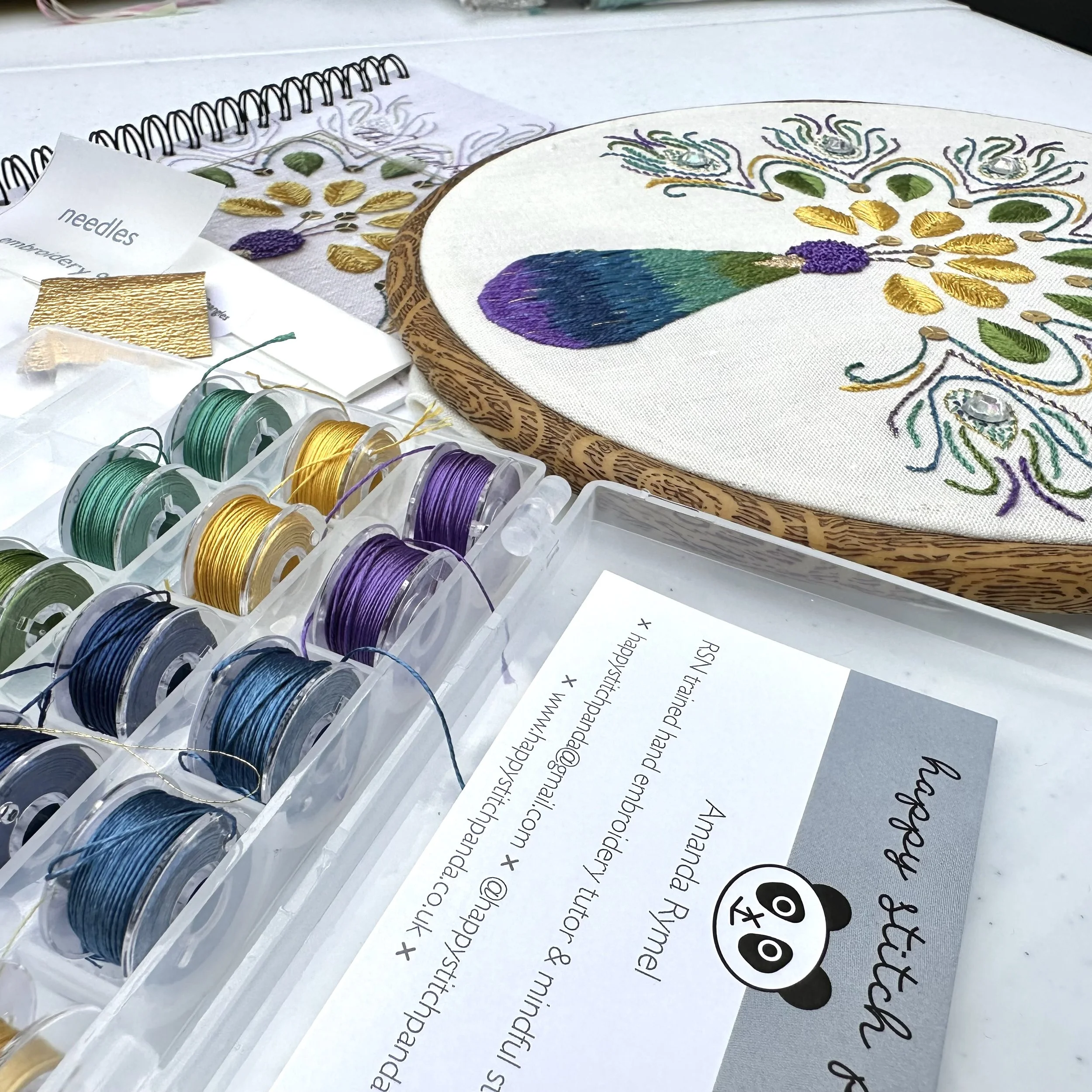 In this immersive live class, you’ll stitch a beautifully stylised peacock using lustrous DeVere silk threads and shimmering Gutermann metallic threads, carefully chosen to create exceptional depth and light-catching brilliance.