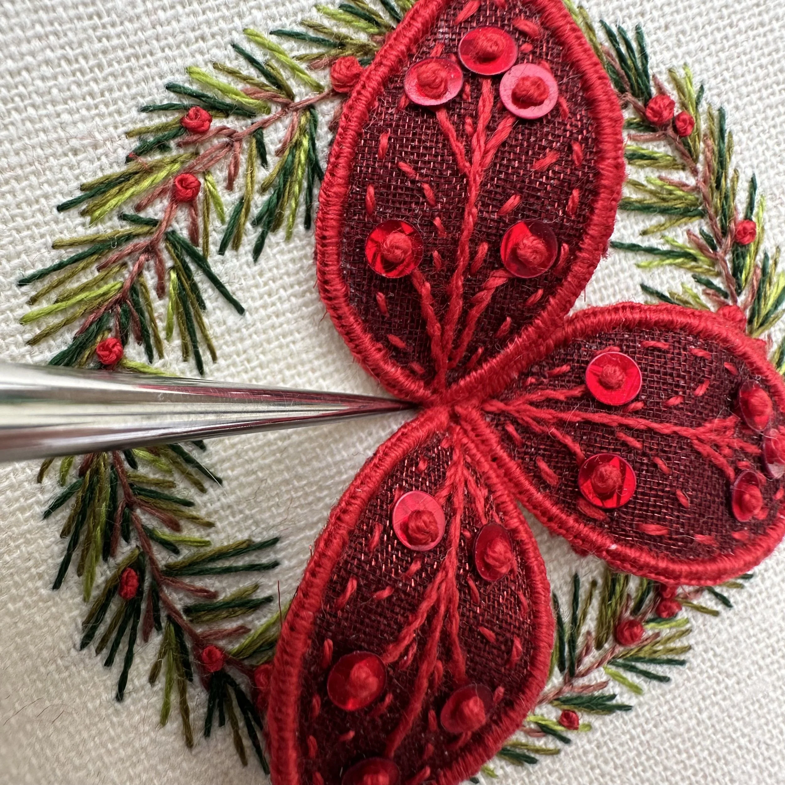 Welcome to the very first limited-edition Stitch Sanctuary Christmas Keepsake: Peaceful Poinsettia! Across four joyful classes, you’ll explore a blend of freestyle embroidery and stumpwork techniques to bring a delicate three-dimensional poinsettia to life, nestled within a festive wreath. Designed to hang proudly on your Christmas tree — or to be framed as a keepsake — this project celebrates the artistry of the season in every stitch. Spaces and kits are strictly limited, and once they’re gone, they truly are gone!
