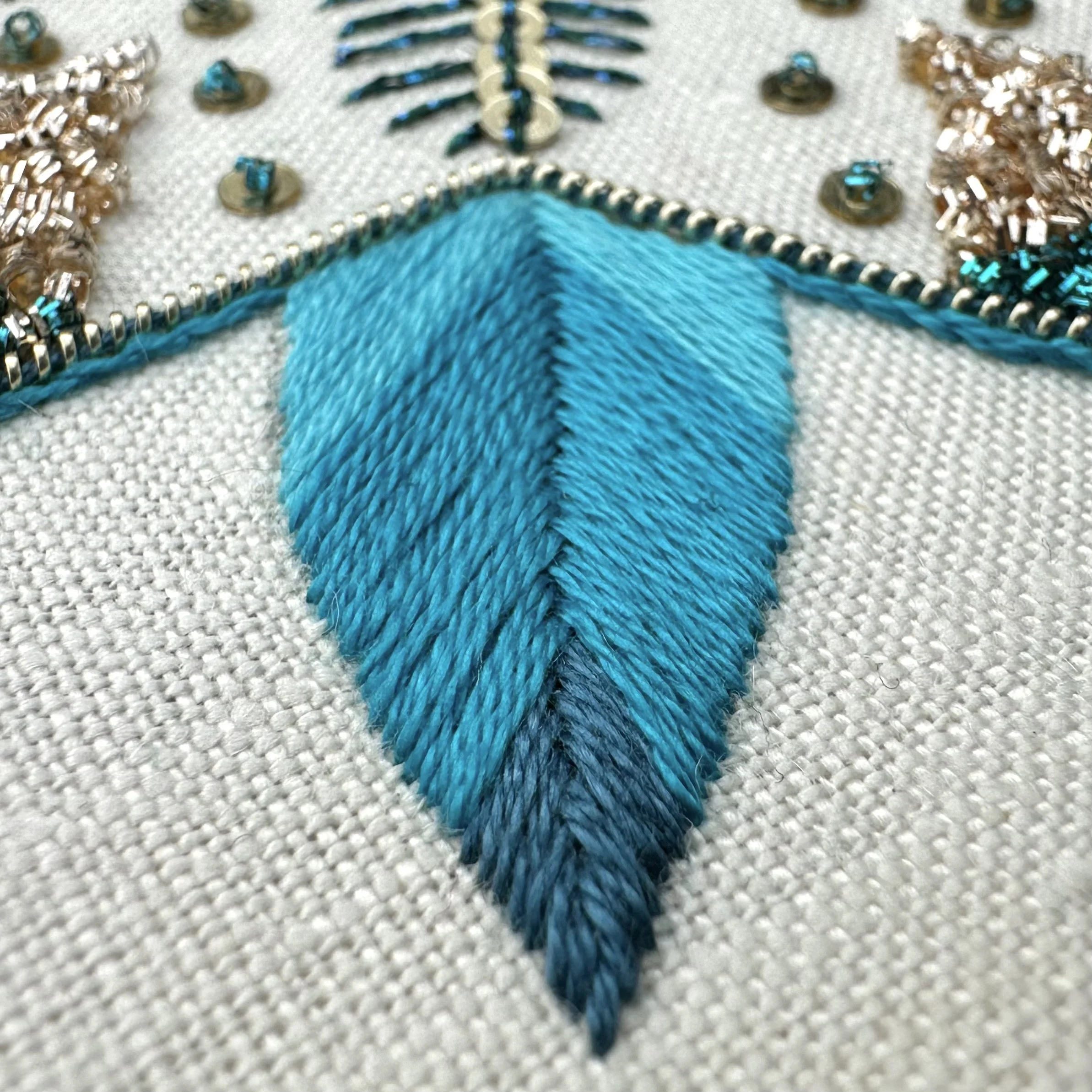 Inspired by the calming symmetry of mindful mandalas, Wheel of Blue Leaves is a soothing yet striking design that celebrates repetition, texture, and gentle shimmer. Flowing blue tones are paired with touches of radiant gold, creating a piece that is both elegant and meditative to stitch.