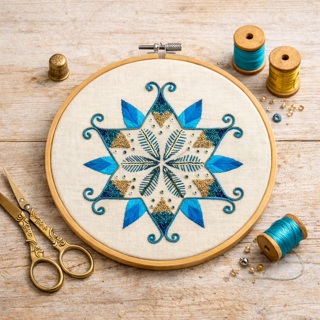 Ideal for embroiderers seeking a calming, rhythmical project while refining stitch control and decorative finishes.